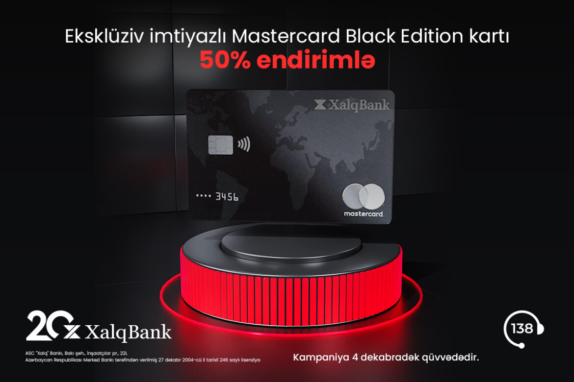 Yeni kampaniyadan yararlanmaqla Xalq Bankın təqdim etdiyi premium üstünlüklərə malik Mastercard Black Edition kartını xidmət haqqı və ilkin mədaxil məbləğinə 50% endirimlə əldə etmək mümkün olacaq: