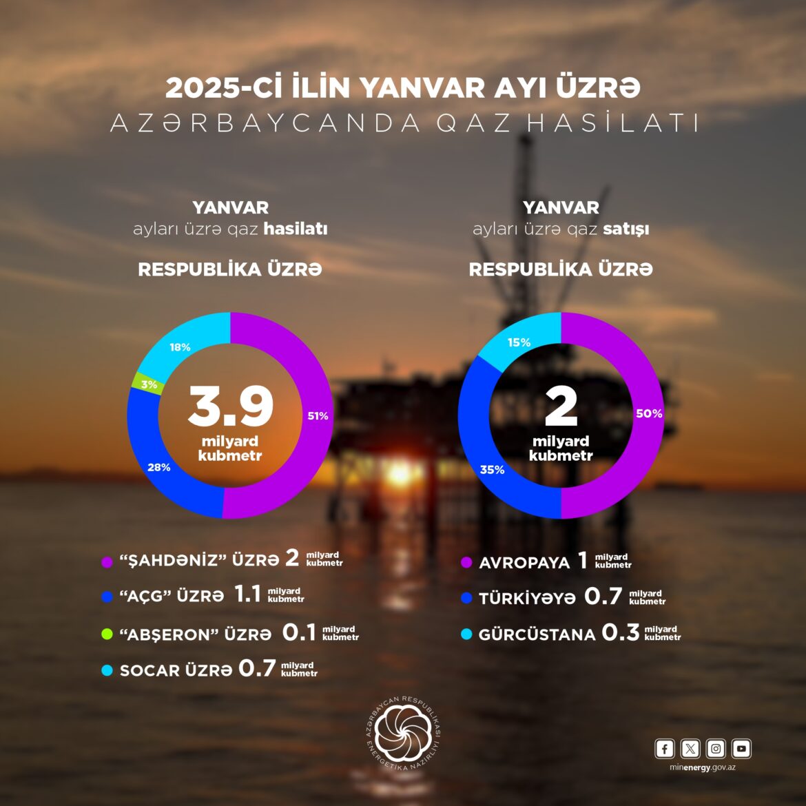 2025-ci ilin yanvar ayında respublikada 3,9 milyard kubmetr təbii qaz hasil edilib. Qazın 1,1 milyard kubmetri “Azəri-Çıraq-Günəşli”nin, 2 milyard kubmetri “Şahdəniz”in, 0,1 milyard kubmetri “Abşeron” yatağının, 0,7 milyard kubmetri SOCAR-ın payına düşüb.