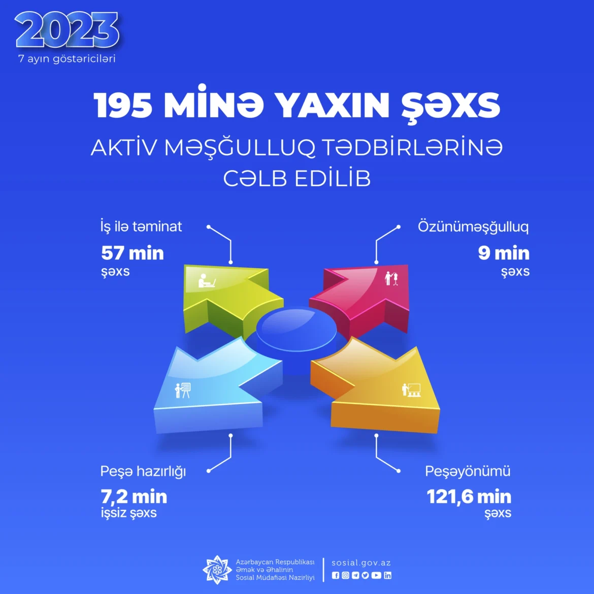 Əmək və Əhalinin Sosial Müdafiəsi Nazirliyinin tabeliyindəki Dövlət Məşğulluq Agentliyi tərəfindən bu ilin yanvar-iyul aylarında 195 minə yaxın şəxs aktiv məşğulluq tədbirləri ilə əhatə olunub.