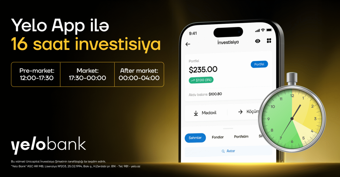 Yelo Invest ilə indi səhmlərə daha çox nəzarət, daha çox rahatlıq və daha çox fürsət sənin əlindədir. Sən də Yelo Invest xidmətindən faydalanıb, əlavə gəlir qazanmaq üçün Yelo App-i yüklə: https://bit.ly/44kUcc0.