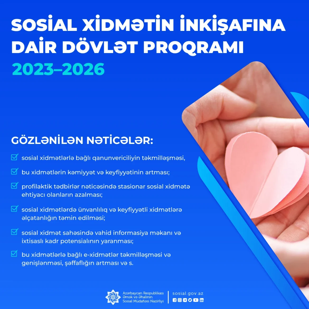 2026-cı ilin sonunadək hamı üçün bərabər iştirak imkanını təmin edən sosial xidmətlər sisteminin və bu sahədə ixtisaslı kadr potensialının formalaşması, sosial xidmətlərin əhatəsinin genişlənməsi, ünvanlılığının və keyfiyyətli xidmətlərə əlçatanlığın təmin edilməsi və əhalinin göstərilən xidmətlərdən məmnunluq səviyyəsinin artması yeni Dövlət Proqramının əsas hədəf göstəriciləridir.